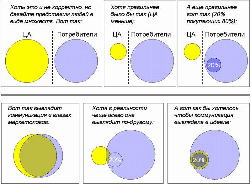 Если для множества "Потребители" она еще не так ярко выражена (поскольку критерием объединения в это множество является факт потребления продукта, а люди потребляют одно и то же, хоть могут и руководствоваться разными причинами), то для множества "ЦА" она стоит весьма остро, потому что это множество практически ничто не объединяет, кроме нашего чаще всего непроверенного представления о том, что они могут потреблять наш продукт.