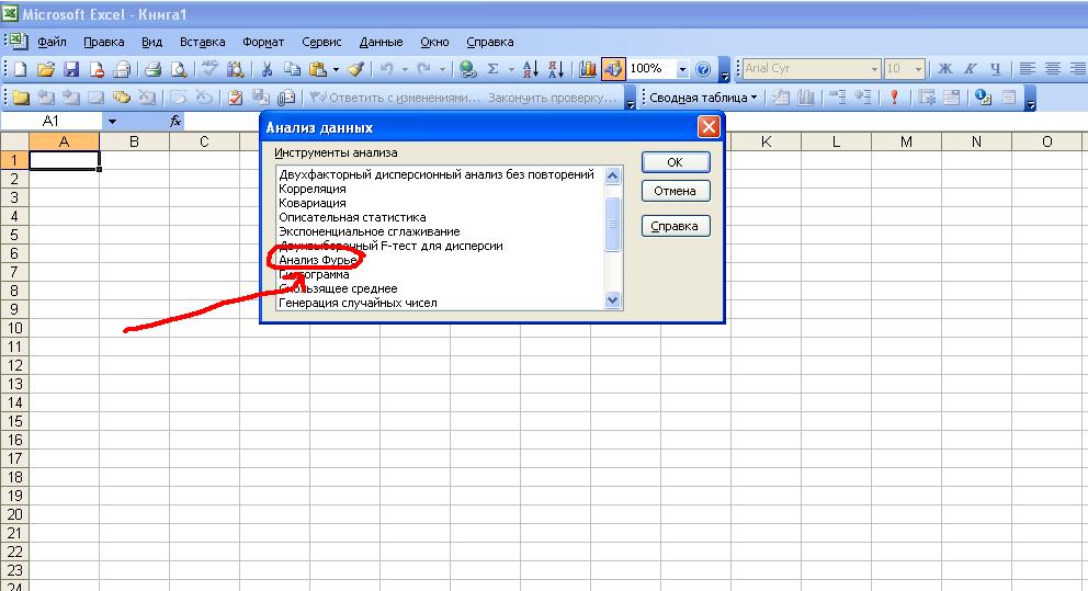 См. вложение. В стандарнтый пакет анализа (устанавливается по первому запросу, или сразу при установке ПО) входит и анализ Фурье и много чего другого интересного (например, удобный интерфейс для решения задач линейного программирования)... |
