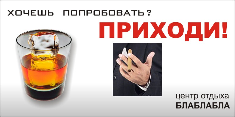 | Вот делаю рекламу для ресторана. Они открыли виски бар и табачный клуб. Макет хотят приблизительно такой: бокал виски, дымящаяся сигара и надпись - Хочешь попробовать? Заходи! Противоречит ли данное творчество закону о рекламе? Приблизительный макет прилагаю |
