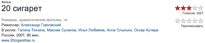 По данным imdb.com, рейтинг Сигарет выше, чем у Самого Лучшего Фильма2, но ниже, чем у Обитаемого Острова. Но это не главное. Интереснее кол-во принявших участие в голосовании, то есть тех, кто посмотрел фильм и в принципе захотел высказать свое мнение: 41 у Сигарет, 136 у Фильма2 и 968 у Острова. И это при том, что Сигареты вышли почти полтора года назад, а Остров с Фильмом 3 и 2 месяца тому назад соответственно. |