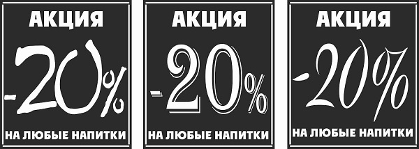 | Здравствуйте, некоторое время назад я открыл магазин разливных напитков. Повесил плакат на окно входной двери и обвел его светодиодкой, помещение отдельное располагается рядом со входом в супермаркет Магнит, плакат сам сделали красного цвета, т.к. Магнит сам весь красный поняли что сливаемся с ним+ люди говорят что нас плохо видно, видно только вечером когда стемнеет потому что светит светодиод. Начал заниматься этим вопросом и решил что от Магнита надо отличится, пришло в голову сделать акцию и напечатать большой плакат на черном фоне белыми буквами "акция 20% на любые напитки" который будет располагаться на второй половине двери(на нижней) + делаю режим работы, его приходится делать тоже в красных тонах, т.к. плакат уже напечатали(который на двери). Ну и штендер зафигачим... Вопрос в том какой цвет использовать мне сейчас? Я дальтоник =)))) Спасибо за ответы))) Жду) Время очень мало, точка работает в минус.... |