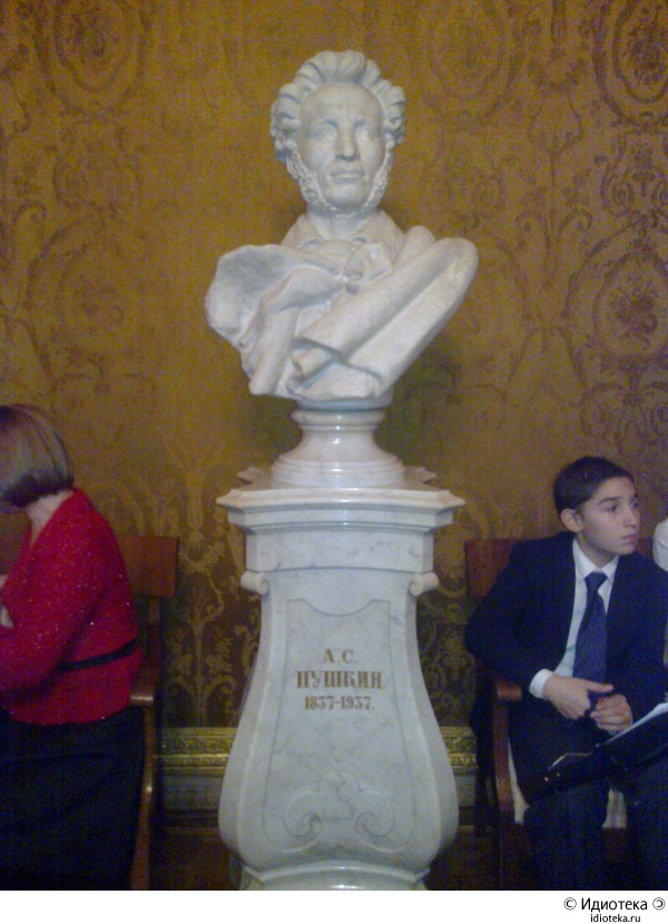 | Этот бюст был установлен в 1937 году в Золотой гостиной Аничкова дворца в Ленинграде по случаю столетия со дня смерти Пушкина - отсюда и даты. Нужно знать историю. |
