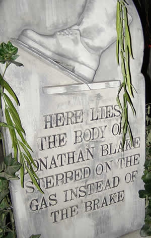 Перевод не в рифму: Тут лежит тело Джонатана Блейка, который перепутал педали газа и тормоза. |