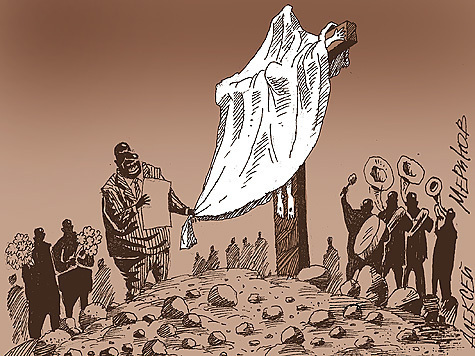 — Это меня Христос изгнал из храма, — радостно сообщил он. — Я не в претензии. Ибо торговля в храме шла не бойко. Мудрым своим перстом Провидец указал новое место, где я открыл теперь ларек. Продажи возросли, прибыль увеличилась. Я счастлив, что судьбе угодно было таким образом направить меня на истинный путь. И готов пожертвовать на памятник безвременно ушедшему от нас Финансовому Гению скромную сумму."
