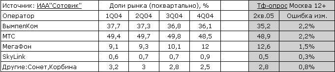 И вот еще какая штука. И вроде бы МТС в Москве сдает позиции: долю рынка в количественном выражении, а в качественном (в доходе) продолжает выигрывать у Билайна.