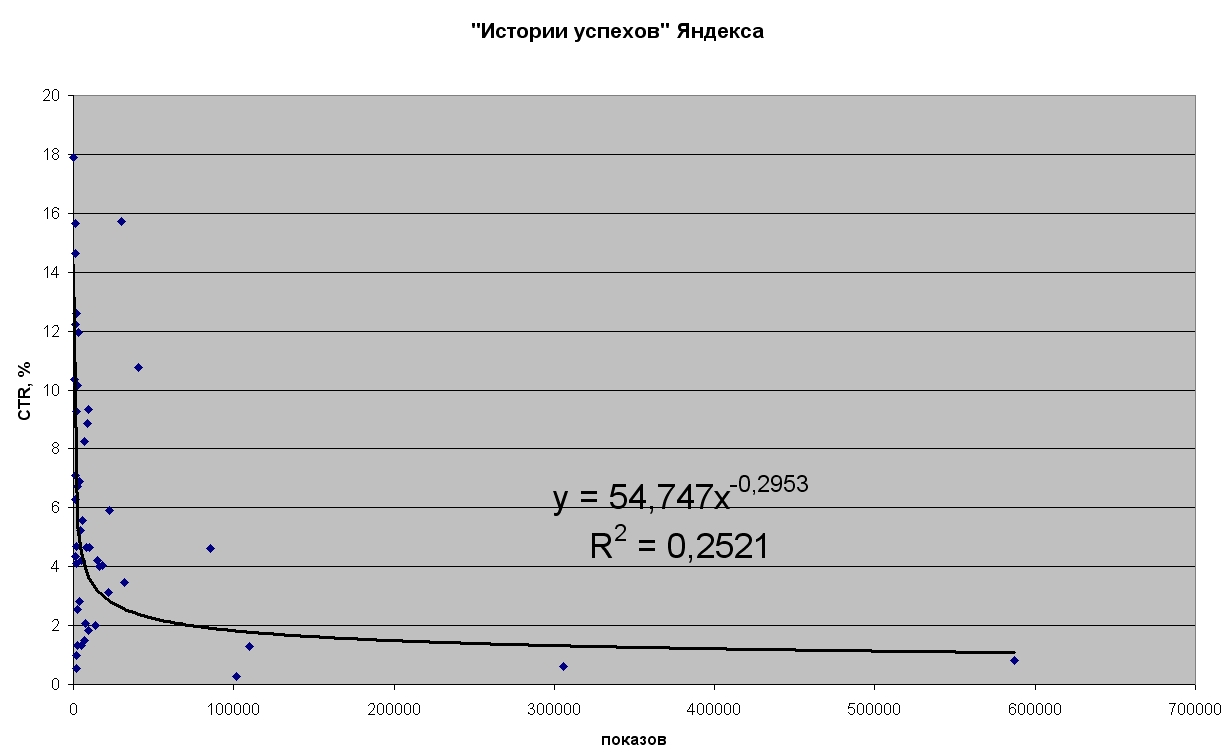 А график по "историям успеха" Яндекса, оси подписаны x-показы, y - CTR. В первом графике это точки сглаженных значений по 11 соседям, по исходным данным совсем "грязно" получается (см. график в этом посте).
