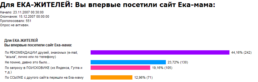 Но роль соц. связей очень существенна. За последние полгода на сайте возникало 3 топика с названием "А как вы пришли на ека-маму" :) Это самим форумчанам интересно и они заводят такие опросы - а мы анализируем . И там ответы не сухие, как в данном опросе "поисковик, аська..", а развернутые - говорят конкретно кто где и когда им сказал про сайт, по какой теме искала информацию в поисковике и нашла этот сайт и прочее.. т.е. это почти фокус-группа Дак вот, читая это сразу видно, что кол-во пришедших по рекомендации очень существенное . :) |