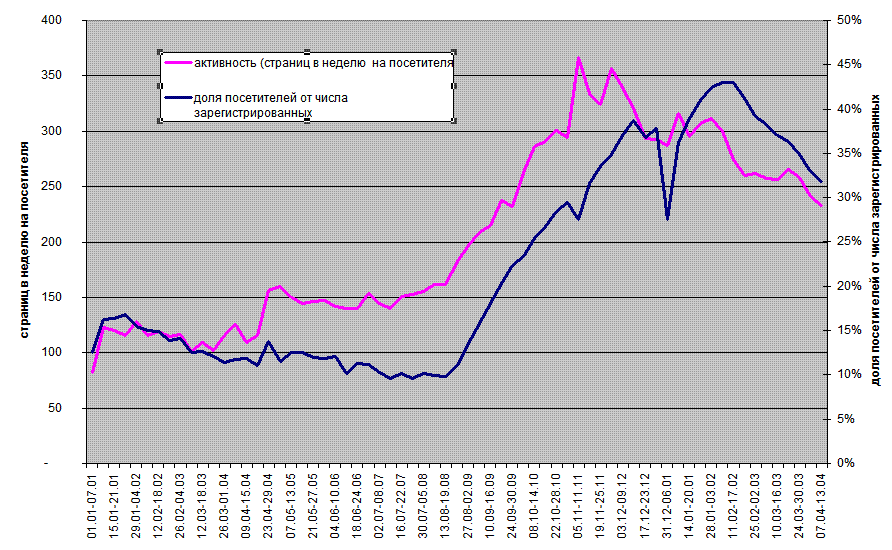 Несмотря на бурный рост аудитории, интенсивность посещений старых пользователей падает. На мой взгляд, объяснение этому может быть только одно: вновь зарегистрированные не "дружат", при регистрации они не устанавливают связей. То есть, к обществу он присоединились, но в него не входят.