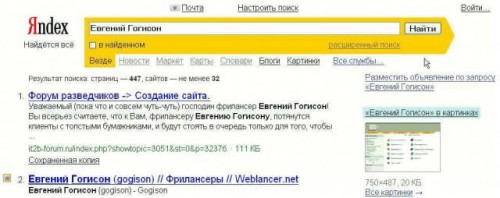 Вчера вечером фрилансер Евгений Гогисон посетил форум IT2B, нашел очередную просьбу о создании сайта, после чего совершил роковую для себя ошибку, разместив свою классическую ссылку на себя любимого. Аудитории форума такая выходка не понравилась, в результате чего фрилансеру Евгению Гогисону была показана неприемлемость его действий. Евгений Гогисон оказался выше подобных материй и удивился: "А что я такого делаю"? В результате была проведена небольшая коррекция информационного поля в отношении назойливо жужжащего в ухо спамера. Продолжение истории - здесь: http://it2b-forum.ru/index.php?showtopic=3606А вот результат истории, который появился через 12 часов после начала акции по пинанию спамера (сообщение о том, что gogison - спамер, стоит на первом месте в выдаче Яндекса): |