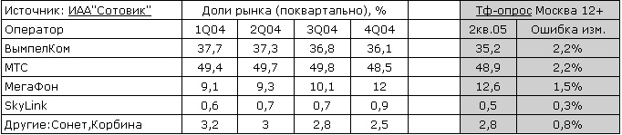 Данные тф-опросов удивительным образом совпадают с анализом С.Аверина(ИАА"Сотовик"). См. табл. ниже. Там серым форматом приведены доли рынка по моим данным (Тф-опрос Мск.) |
