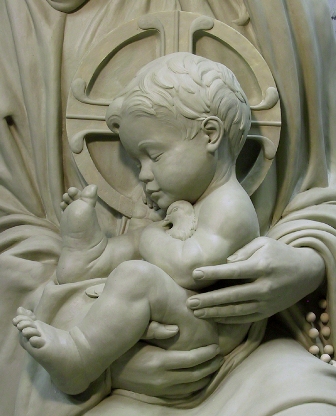 | Вообще-то, это Христос. На коленях у Богоматери. Похоже на Италию. Посмотрите в итальянском искусстве 15-16 веков. |