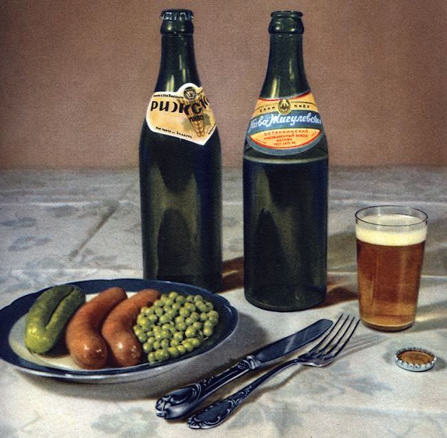 несостыковочка... выпить и не закусить (я понимаю - после первой не закусывают)? Сосиски не тронуты, огурец не надкушен... Опять же пиво налито... Или они призывают рюмку водку литром пива шлифовать ??? |