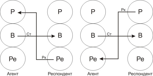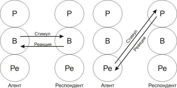 Трансакцией мы назовем единицу общения. Люди, находящиеся вместе в одной группе, неизбежно говорят друг с другом или иным путем показывают свою осведомленность о присутствии друг друга. Это мы назовем трансакционным стимулом (Ст). Человек, к которому обращен трансакционный стимул, в ответ что-то скажет или сделает. Этот ответ назовем трансакционной реакцией (Рк). Человека инициирующего общения, то есть выдавшего трансакционный стимул назовем агентом, а отреагировавшего – респондентом.