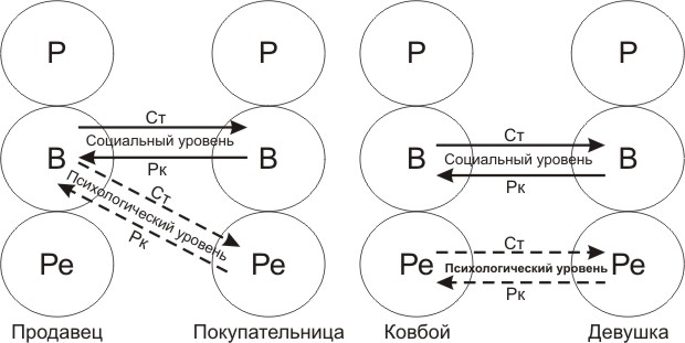 На рисунке 3 справа видно, что на социальном уровне происходит разговор о конюшнях между Взрослыми, в то время как на психологическом уровне это разговор Ребенка с Ребенком и его содержание – сексуальные взаимоотношения (заигрывание). На поверхности инициатива принадлежит Взрослому, но исход большинства подобных игр на самом деле предопределяет Ребенок, так что участников игры может ждать сюрприз.
