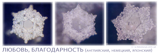 Исследования знаменитого японского ученого и целителя Масару Эмото показывают, что вода способна впитывать, хранить и передавать человеческие мысли и эмоции. Форма кристаллов льда, образующихся при замерзании воды, не только зависит от ее чистоты, но и изменяется в зависимости от того, какую над этой водой исполняют музыку, какие ей показы-вают изображения и произносят слова, и даже от того, думают люди о ней или не обращают на нее внимания.