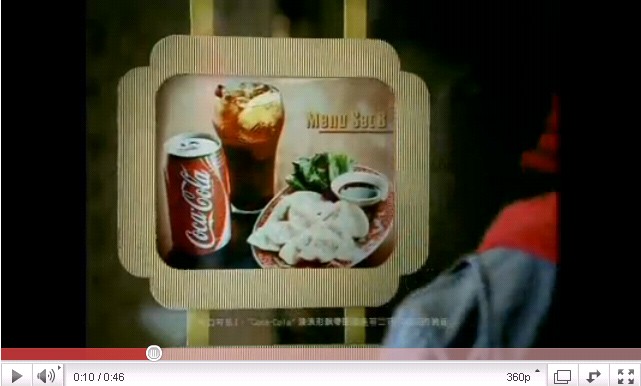 рекламный ролик Coca-cola. Реклама называется – [тут иероглифы] (верни меня домой), в главной роли известный китайский спортсмен Liu Xiang (бег с препятствиями). Суть в том, что на Китайский Новый год (по традиции в Китае на новый год едят пельмени), он не дома, а в Париже. Заходит в ресторан... Ему подают порцию пельменей, он от ужаса - обпивается кака-колой и попадает домой... И с помощью волшебной кока-колы, он успевает на семейный праздник...