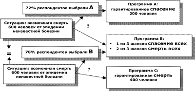 Представив задачу в наглядной форме, можно достаточно легко идентифицировать нерациональность (нетранзитивность) выбора, который сделан большинством респондентов. Следует, при этом, обратить внимание на то, что варианты А и С эквивалентны фактически, но имеют диаметрально противоположные формулировки.