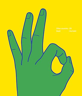 Школа английского языка Wall Street Institute в серии плакатов показывает, что нужно было быть осторожным за границей с жестами. Так, этот знак, который во всех странах значит "О’кей", в Бразилии означает грубое наименование "пятой точки". |
