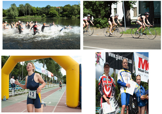 Триатлон (вид спорта) — вид спорта, включающий в себя три вида спортивных состязаний: плавание, велогонку и бег по шоссе.