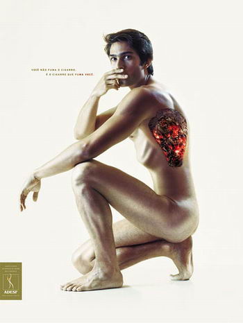 Рекламное агентство NeoGama BBH показало красивых молодых людей в обнаженном виде, при этом их легкие представлены в виде тлеющего сигаретного пепла в момент затяжки.