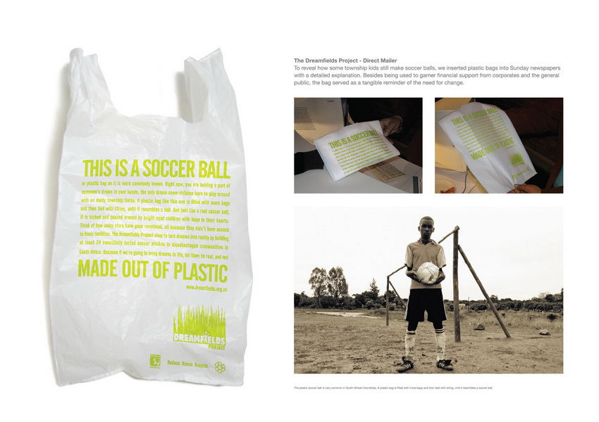| This is a soccer ball or plastic bag as it is more commonly known. Right now, you are holding a part of someone’s dream in your hands, the only dream some children have to play around with on dusty township fields. A plastic bag like this one is filled with more bags and then tied with string, until it resembles a ball. And just like a real soccer ball, it is kicked and passed around by bright-eyed children with hope in their hearts. Think of how many stars have gone unnoticed, all because they didn’t have access to basic facilities. The Dreamfields Project aims to turn dreams into reality by building at least 24 beautifully turfed soccer pitches in disadvantaged communities in South Africa. Because if we’re going to bring dreams to life, let them be real, and not made out of plastic. |
