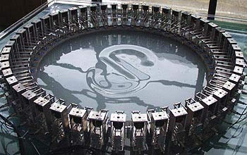 Фигура формируется за счет так называемых цилиндрических волн. В этом жидкостном “дисплее” используется 50 генераторов волн, окружающих круглый бассейн диаметром 1,6 метра и глубиной 30 см. Каждая такая волна может условно считаться “пикселем”, диаметром в 10 см и высотой 4 см. Волны-”пиксели” складываются в нужные линии с частотой раз в три секунды.