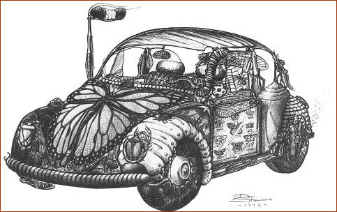 В конце 90х и, чуть позднее, Дон Стюарт нарисовал работы, посвященные известному автомобилю Volkswagen (”Жук”). Получилась весьма интересная и любопытная работа, как можно судить по приведенным иллюстрациям. Весть об этом оригинальном симпатичном «жуке» дошла до самой фирмы Volkswagen. Как вы думаете, как она поступила?