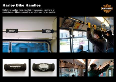 Реклама Харлей Девидсон при помощи накладок на ручки в общественном транспорте от Wirz Werbung/BBDO, Zurich, Switzerland