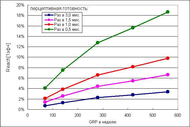 Данные на графике для ТВ: GRP=140(20GRP в сутки), период плэннинга 1 неделя. Можно построить кривые с учетом активности конкурентов, тогда кривые лягут чуть ниже Reach(1эф+). Аналогичные кривые легко построить и для других носителей (Радио, Пресса, Наружка) и для их медиамикса конечно тоже.