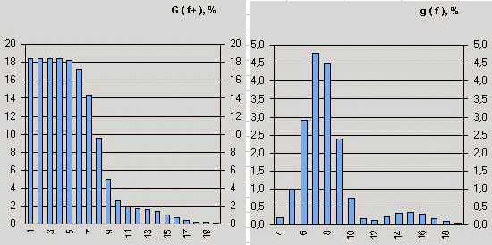 Получается, что в среднем пенсионер посещает больницу 7 раз в мес. (см. на графике g(7)это самая большая палка). Сумма "палок" даст нам месячный Охват=0,7%. Можно построить и типовой график Охвата1+ [G(f+)]