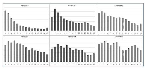 Мы применили эту методологию к данным, полученным от 38 рекламодателей, чьи кампании проходили во второй половине 2003 г. Для каждого рекламодателя мы вычислили уровень конвертации (в расчет брались клики по баннеру) при каждой частоте. Они были проиндексированы рекламодателями (таким образом, чтобы рекламодатели с более высоким уровнем конвертации не доминировали) и сведены. Как вы видите, уровень конвертации при первом контакте был наивысшим, более половины рекламодателей имели именно такие показатели. Для кого-то подобные выводы могут показаться откровением, но на самом деле, они интуитивно чувствуются. В любой конкретный момент есть только небольшое кол-во пользователей, немедленно реагирующих на вашу рекламу. Таким образом, результаты кампании будут зависеть от ее возможности достижения максимального охвата при оптимальной частоте и увеличения частоты контактов с пользователями, которые видели лишь несколько рекламных сообщений. Хотя глобальные результаты показывают ясную картину, при которой уровень конвертации самый высокий при самой низкой частоте (первые контакты), более подробный анализ каждого рекламодателя выявляет более значимые детали. Давайте посмотрим на различия в уровне конвертации у 6 турагентств, представленные на последующих диаграммах.