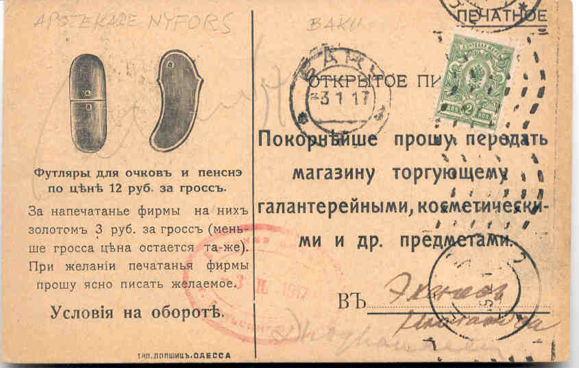 Населенный пункт подписан от руки (поселок под Баку, штемпель ставился на почтовой станции, например, почтамте; обратите внимание, что в Одессе для исходящих уже использовался штемпельный автомат, с бумагоподачей справлялись плохо, из-за этого кроме штемпеля идут волнистые линии для погашения марки; в то время почтовые марки также использовались вместо разменной медной монеты). То есть Левинсон посылал только туда, где у него не было покупателя. Тогда в таких поселках/городках был один, максимум два магазина галантерии (а мог и не быть в принципе), при этом он знал, что от того же почтальона конкуренты узнают, что предложение получили оба и не станет торговать ни один; то есть в поселок посылалась только одна открытка.