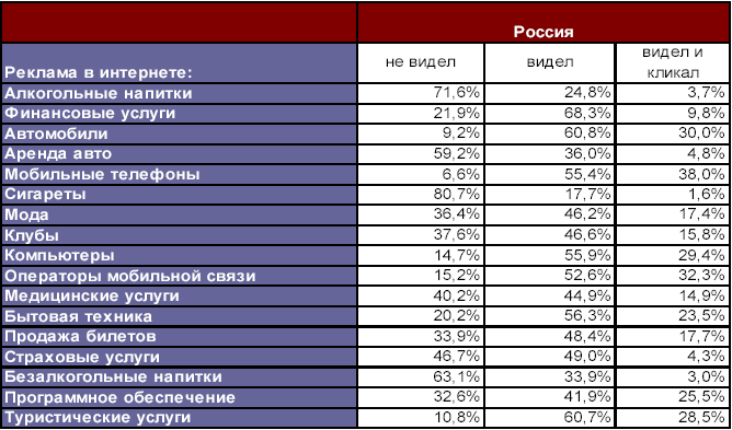 В настоящее время в России наибольший интерес к интернет-технологиям продвижения проявляют финансовые структуры (до 45% рынка), в несколько меньше степени - компании, занимающиеся недвижимостью и продажей автомобилей. По оценкам Energy Consulting, средний российский банк тратит до 10% рекламного бюджета на подобные маркетинговые методы. По их прогнозам, в ближайшее время эта цифра у крупных банков может увеличиться до 30-40%.