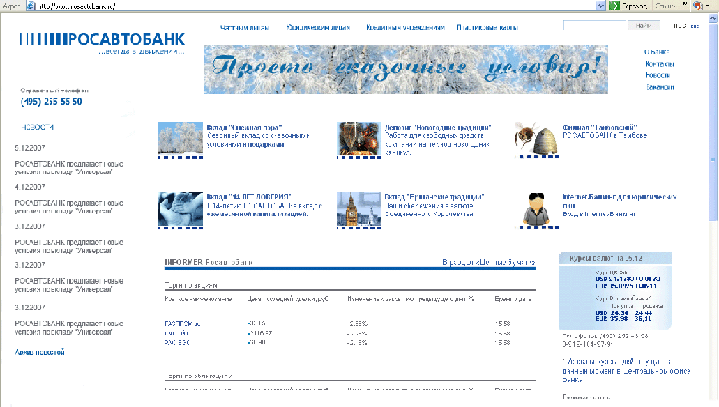 К словам asdf27© добавлю: информация на главной очень трудно воспринимается... ту же таблицу можно было сделать более читабельной, например, отделить строки друг от друга (одна белая, другая серая) или еще как-нибудь. Кроме того, трудно найти вторую менюшку (о банке.. ). Зафигачили ее в правый верхний угол - последнее место, в которое посетитель бросит свой взгляд. А менюшка играет одну из главных ролей на сайте. |