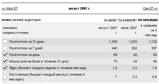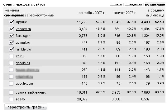 | Выложите сюда, пожалуйста, скрин графика "переходы с сайтов по месяцам (суммарные)" по этим пяти первым источникам. Он как раз с июля 2007 года будет. И еще графики просмотры на посетителя и длительность сессий по месяцам. И график посещаемости по месяцам. |