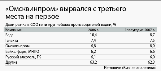 Данные Росстата по отгрузкам действительно показывают совершенно другую картину лидеров отрасли. Так, в первом полугодии 2007 года первое место принадлежало московскому "Кристаллу" (7,6%), второе "Русскому алко­голю" (7,5%), третье "Синергии" (4,3%), четвертое "Веде" (4,2%), пятое "Омсквинпрому" (3,7%).