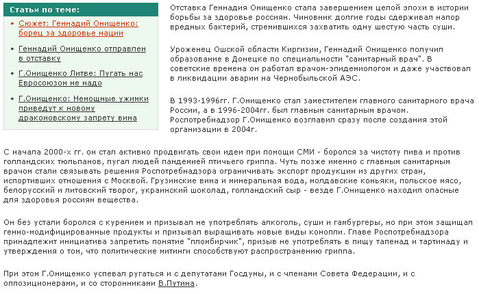 Еще до «горячей» войны августа 2008 года Онищенко выиграл у Грузии холодную войну, запретив грузинское вино и «Боржоми». Чем придал этим напиткам вполне диссидентский статус: один мой приятель, например, специально зовет на грузинское вино, когда привозит его из Минска…