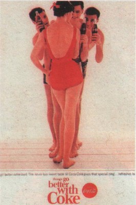 | Опять же в конце 40-х Лоуи принял предложение компании Кока-Кола разработать для неё новый логотип. Заодно он изменил вид бутылки для этого напитка, сделав её сужающейся посередине наподобие женской талии. Бутылку стало гораздо удобнее держать в руке, а в рекламе использовался мотив сравнения формы бутылки с фигурой молодой девушки в купальнике. |