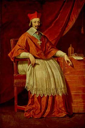 Портрет кардинала Ришелье кисти Филиппа де Шампаня (поверх кардинальского облачения на талии виден полуснятый пчельник, выполненный в технике "ришелье", левая рука лежит на шершневом улье, поверх которого стоит бутылка с маслом от осиных укусов)